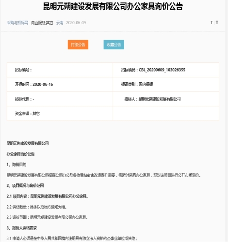昆明元朔建设发展有限公司办公家具询价公告