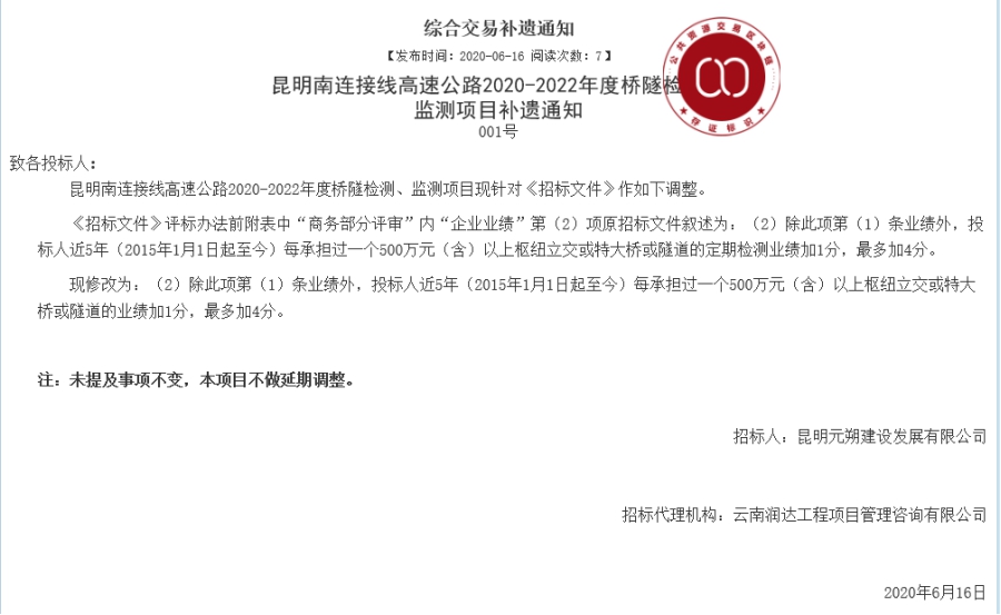 昆明南连接线高速公路2020-2022年度桥隧检测、监测项目补遗通知