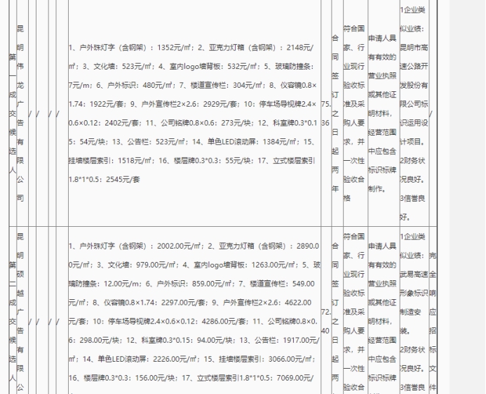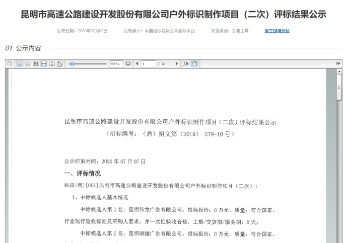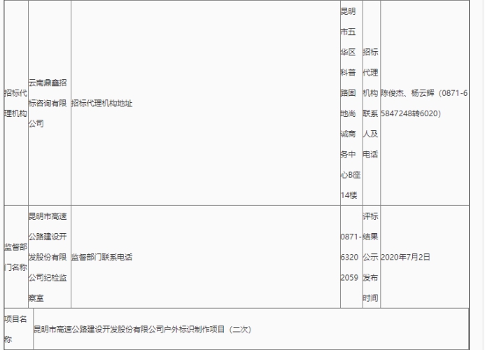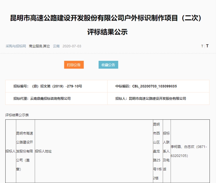 昆明市高速公路建设开发股份有限公司户外标识制作项目(二次)评标结果公示