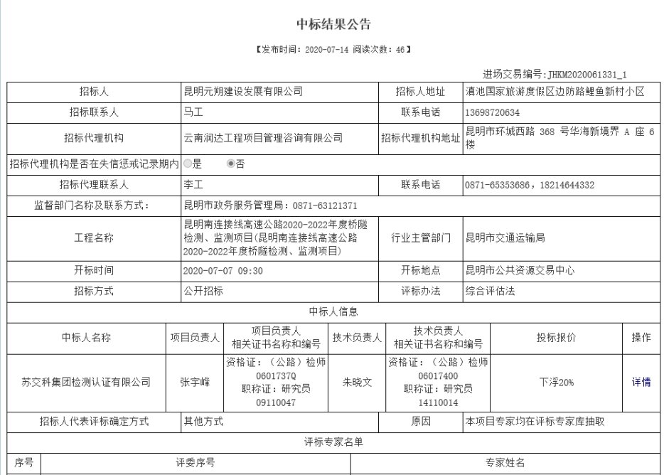 昆明南连接线高速公路2020-2021年度桥隧检测、监测项目中标结果公示