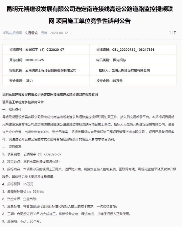 昆明元朔建设发展有限公司选定南连接线高速公路道路监控视频联网项目施工单位竞争性谈判公告