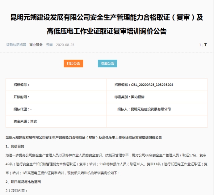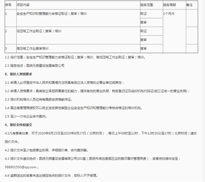 昆明元朔建设发展有限公司安全生产管理能力合格取证(复审)及高低压电工作业证取证复审培训(二次)询价公告