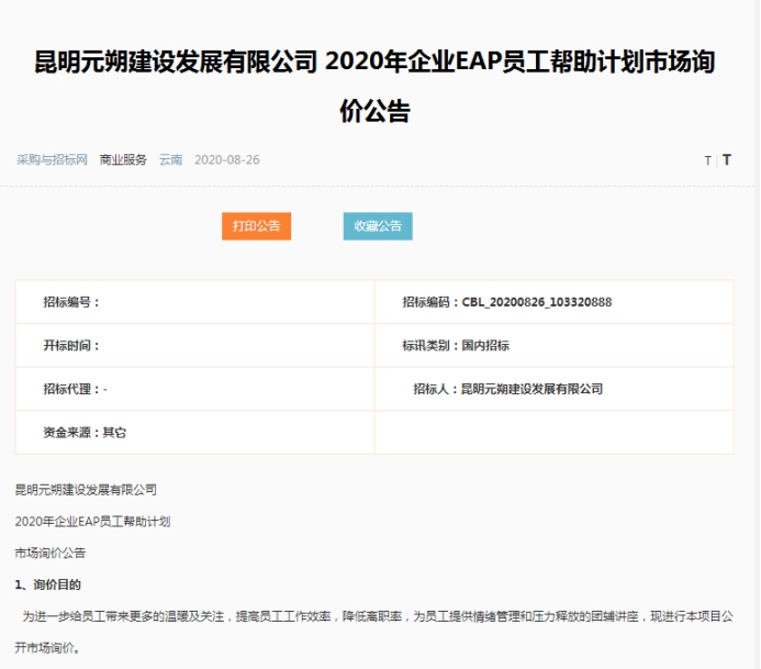 昆明元朔建设发展有限公司2020年企业EAP员工帮助计划市场询价公告