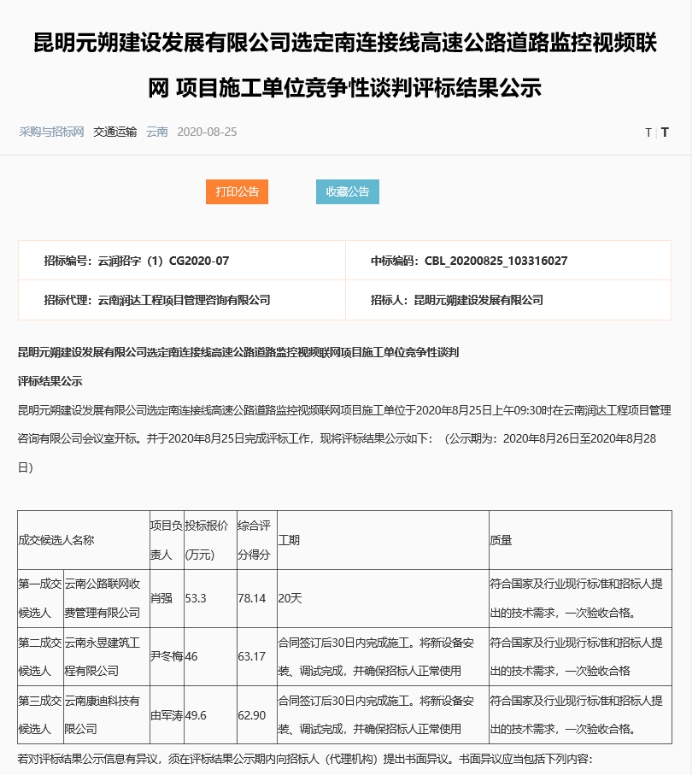 昆明元朔建设发展有限公司选定南连接线高速公路道路监控视频联网项目施工单位竞争性谈判评标结果公示