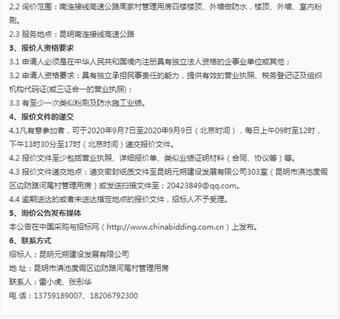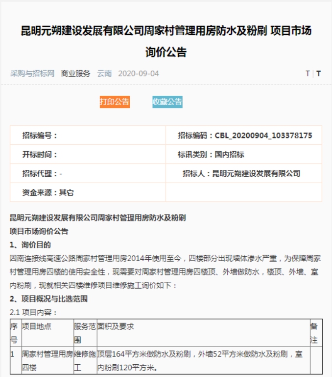 昆明元朔建设发展有限公司周家村管理用房防水及粉刷项目市场询价公告