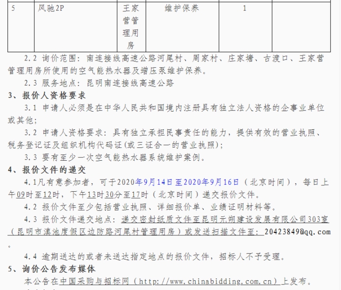 昆明元朔建设发展有限公司空气能热水器系统维护保养市场询价公告(二次)