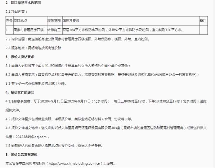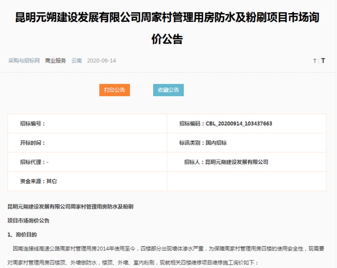 昆明元朔建设发展有限公司周家村管理用房防水及粉刷项目市场询价公告(二次)