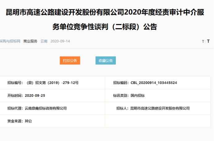 昆明市高速公路建设开发股份有限公司2020年度经责审计中介服务单位竞争性谈判(二标段)公告
