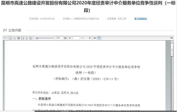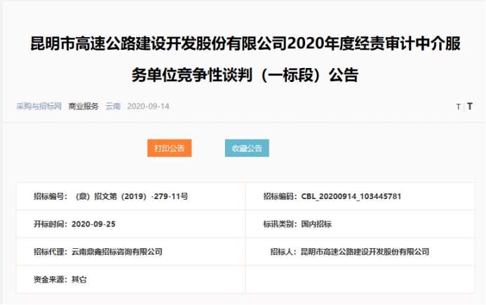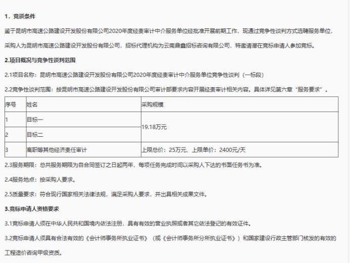 昆明市高速公路建设开发股份有限公司2020年度经责审计中介服务单位竞争性谈判(一标段)公告
