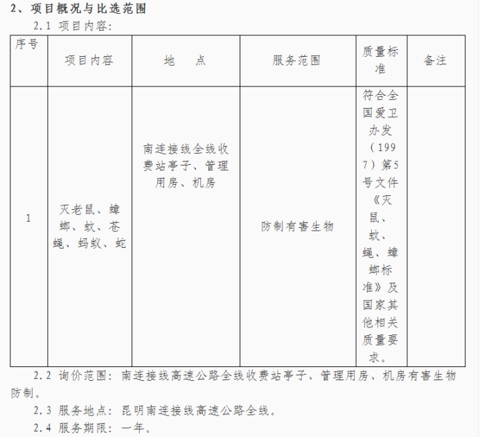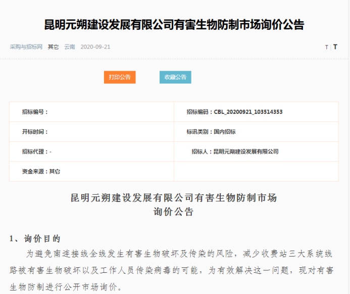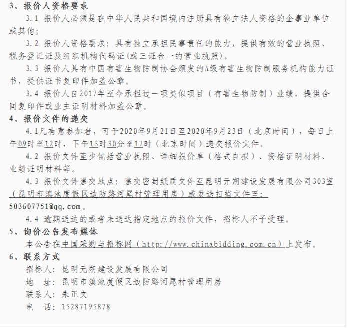 昆明元朔建设发展有限公司有害生物防制市场询价公告