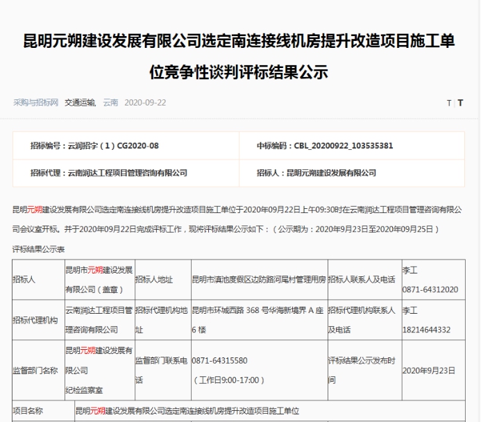 昆明元朔建设发展有限公司选定南连接线机房提升改造项目施工单位竞争性谈判评标结果公示