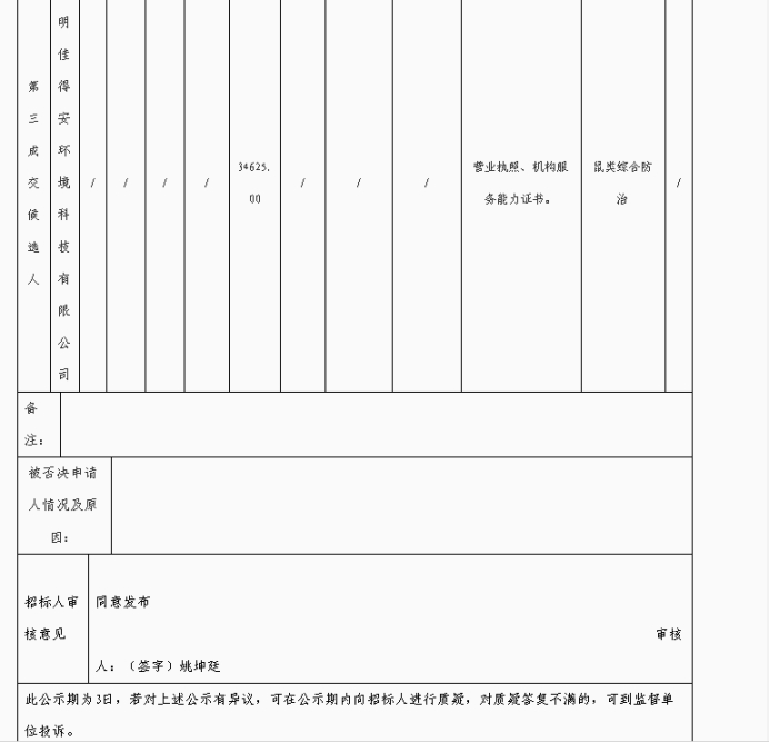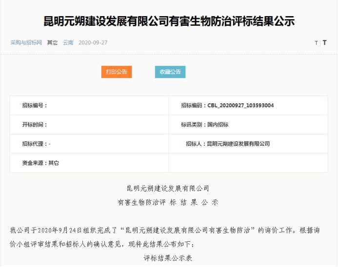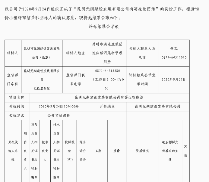 昆明元朔建设发展有限公司有害生物防治评标结果公示