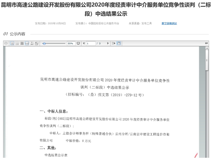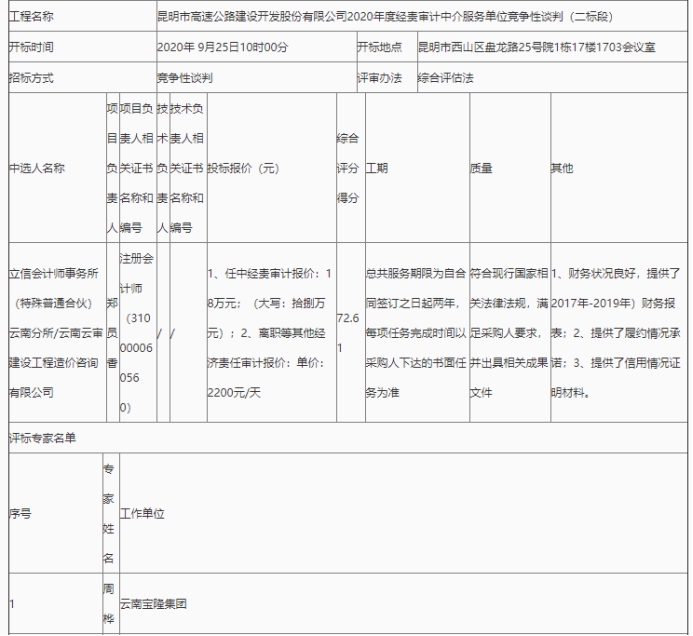 昆明市高速公路建设开发股份有限公司2020年度经责审计中介服务单位竞争性谈判(二标段)中标结果公示