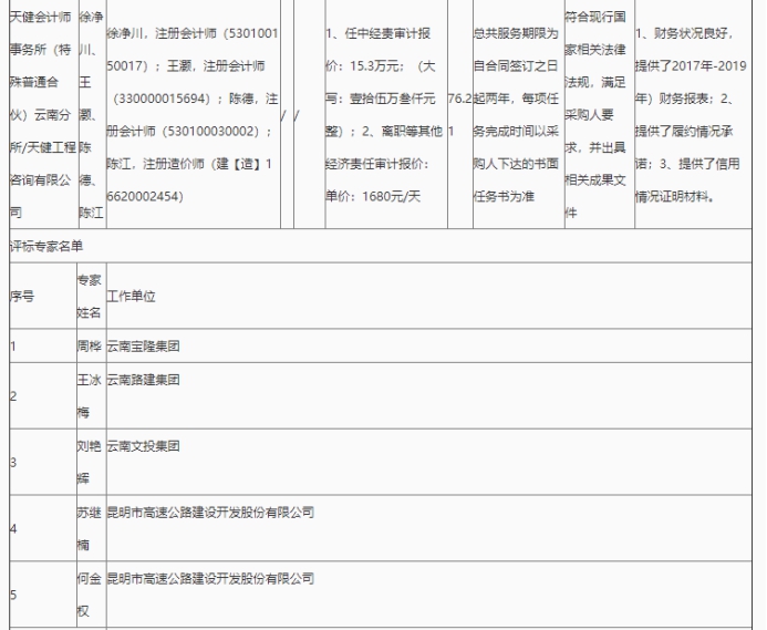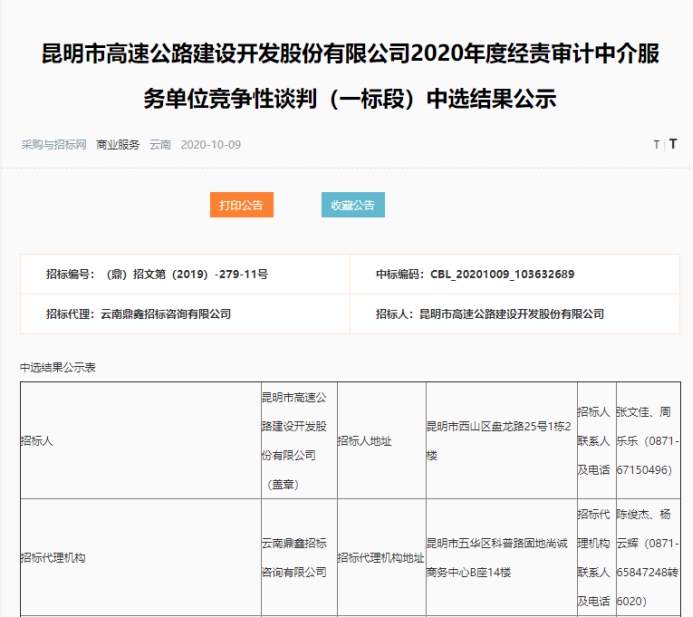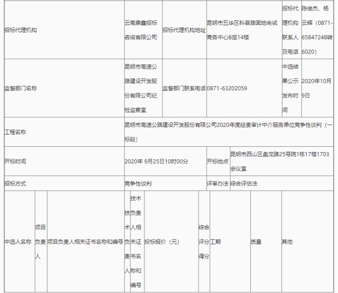 昆明市高速公路建设开发股份有限公司2020年度经责审计中介服务单位竞争性谈判(一标段)中标结果公示