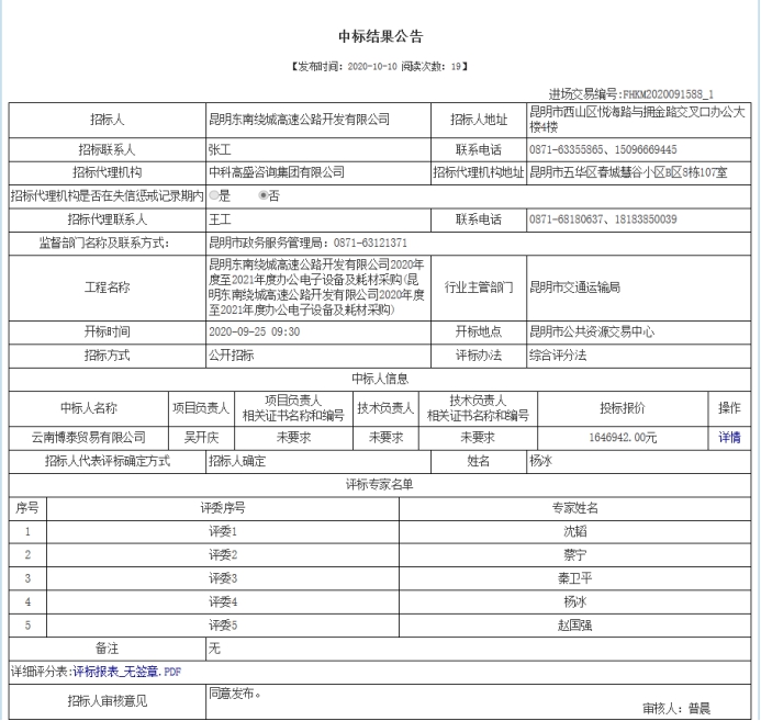 昆明东南绕城高速公路开发有限公司2020年度至2021年度办公电子设备及耗材采购中标结果公告