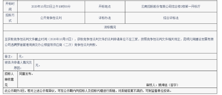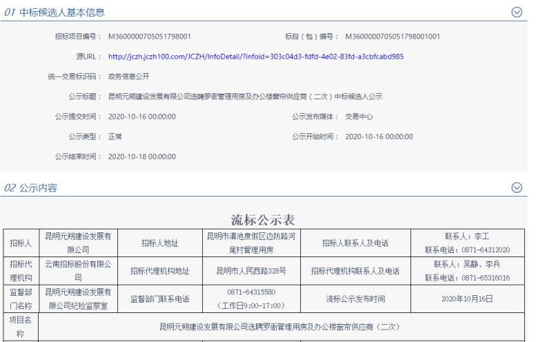 昆明元朔建设发展有限公司选聘罗衙管理用房及办公楼窗帘供应商(二次)流标公示