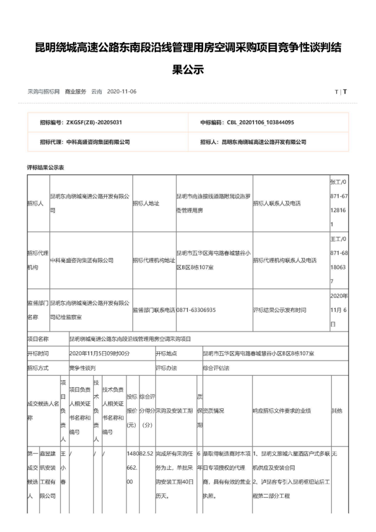 昆明绕城高速公路东南段沿线管理用房空调采购项目竞争性谈判结果公示