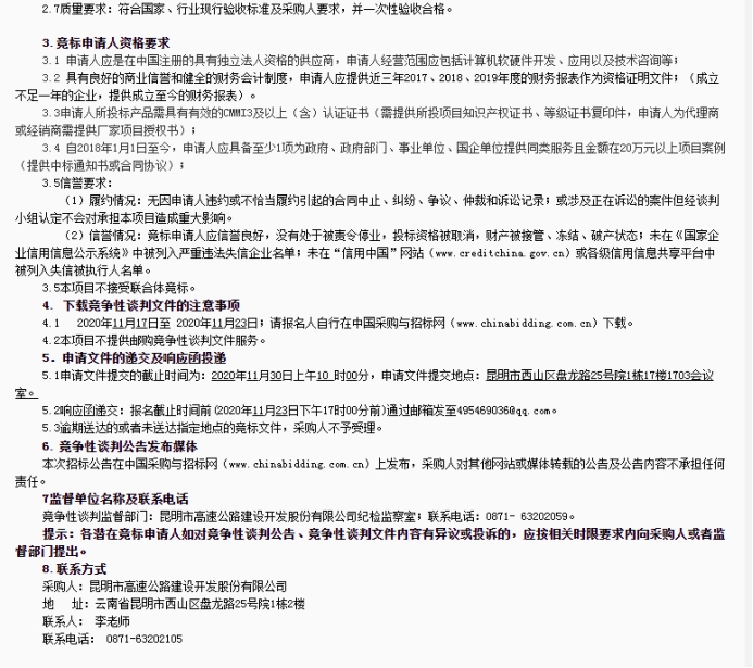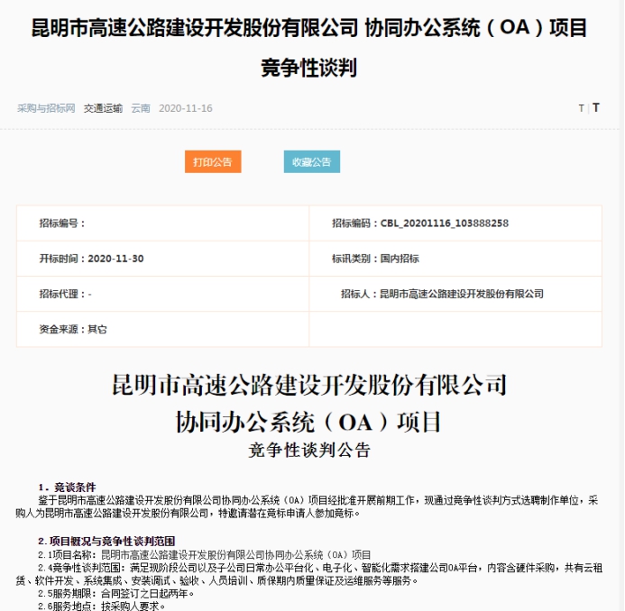 昆明市高速公路建设开发股份有限公司 协同办公系统(OA)项目竞争性谈判