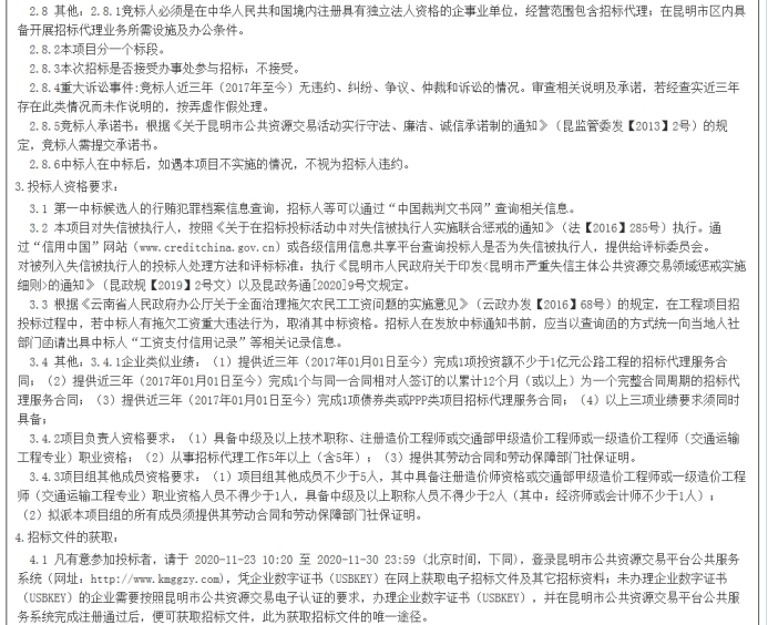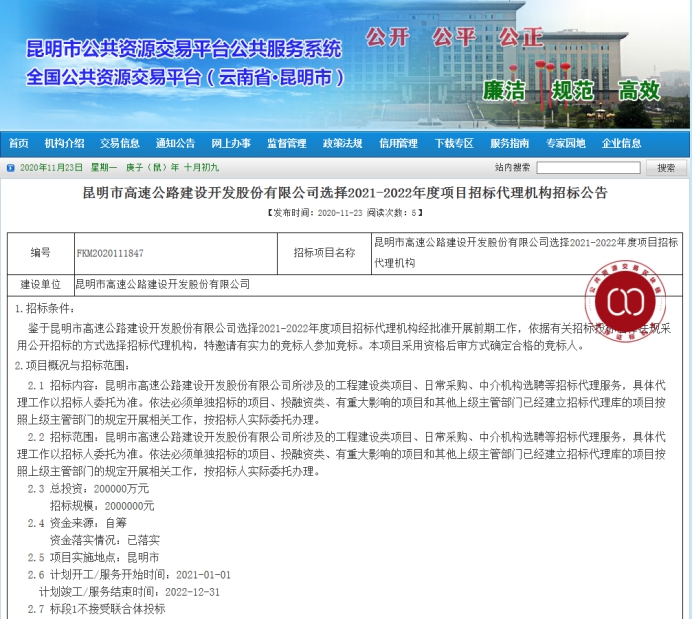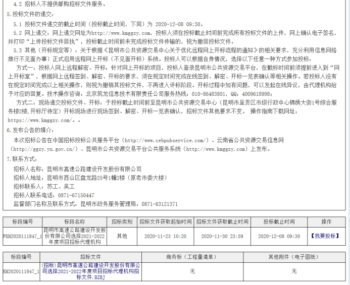 昆明市高速公路建设开发股份有限公司选择2021-2022年度项目招标代理机构招标公告