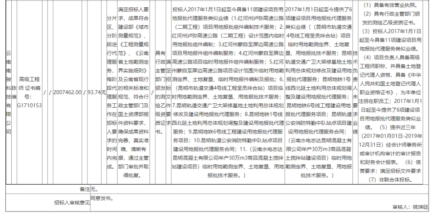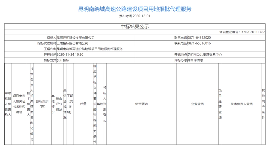 昆明南绕城高速公路建设项目用地报批代理服务中标结果公示