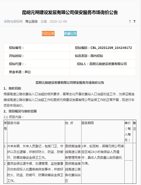 昆明元朔建设发展有限公司保安服务市场询价公告