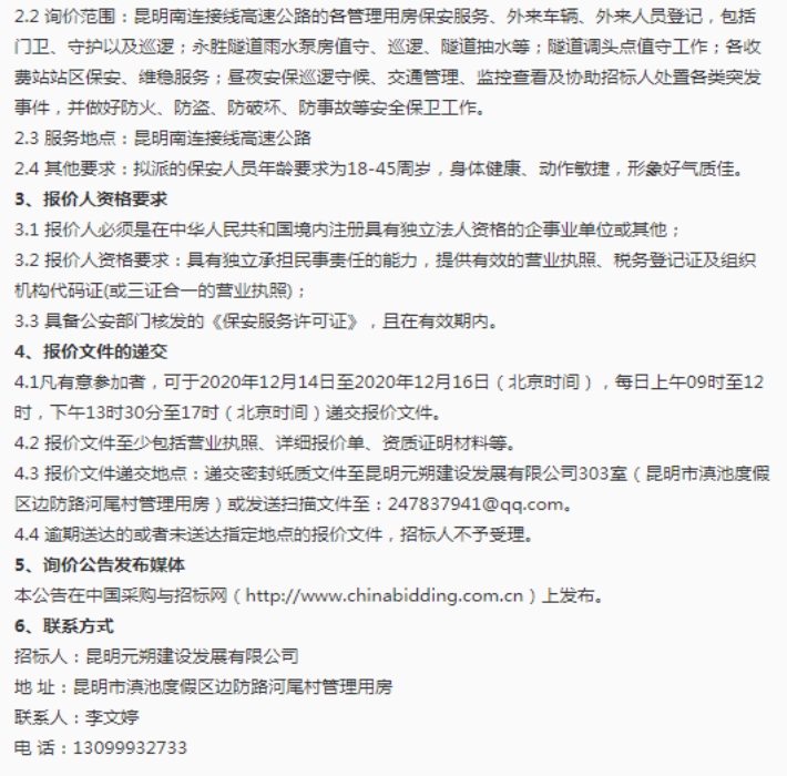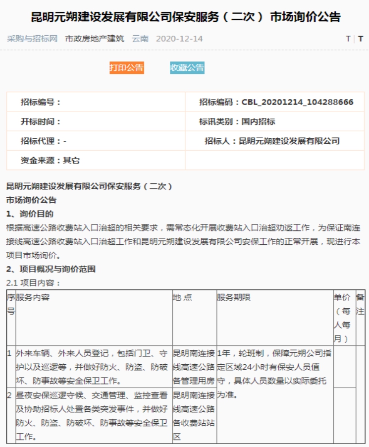 昆明元朔建设发展有限公司保安服务(二次)市场询价公告