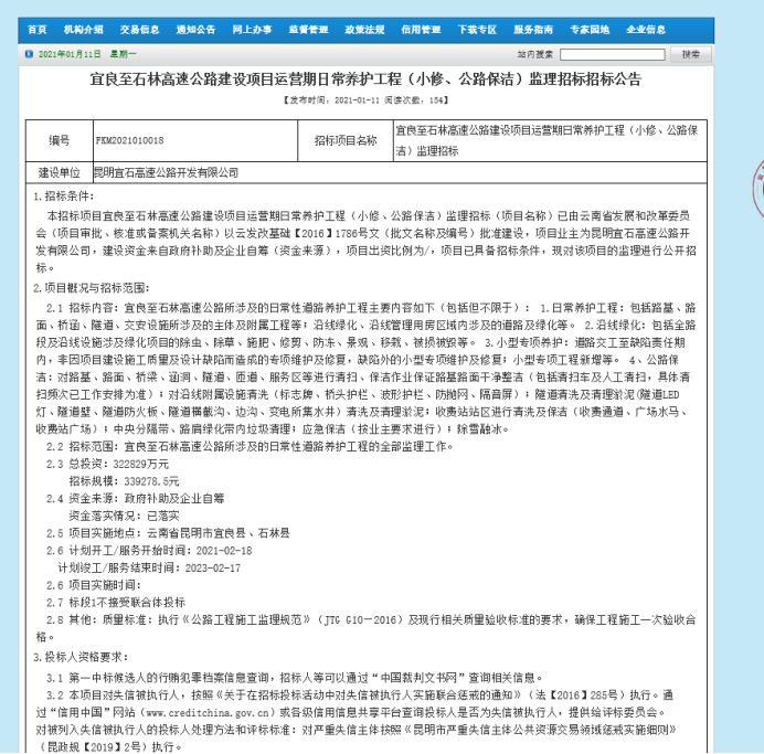 宜良至石林高速公路建设项目运营期日常养护(小修、公路保洁)监理招标招标公告
