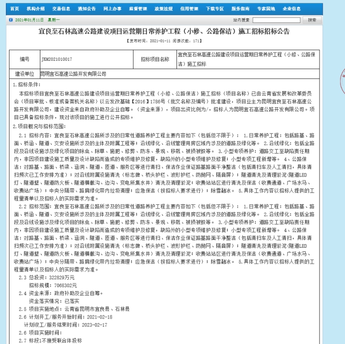 宜良至石林高速公路建设项目运营期日常养护(小修、公路保洁)施工招标招标公告