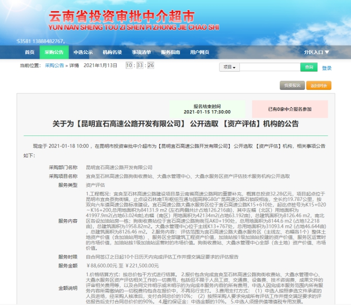 关于为【昆明宜石高速公路开发有限公司】公开选取 【资产评估】机构的公告