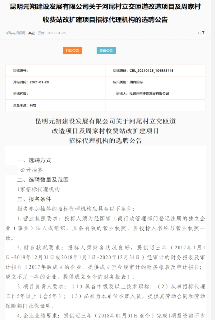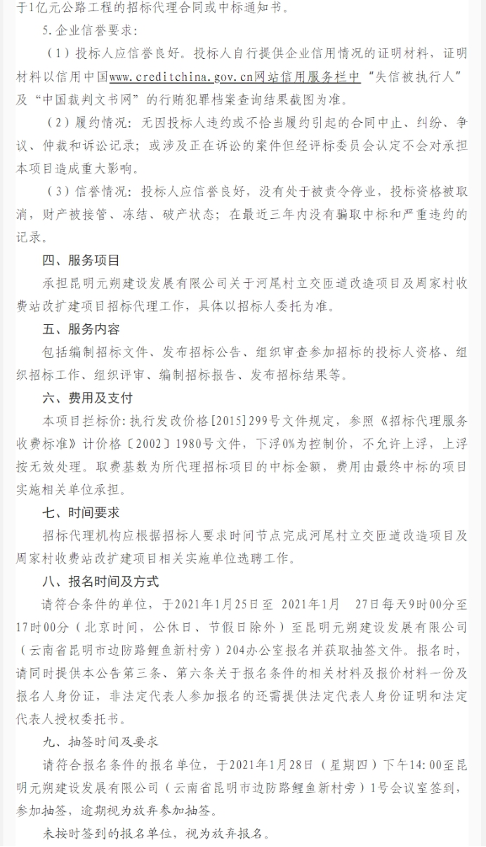 昆明元朔建设发展有限公司关于河尾村立交匝道改造项目及周家村收费站改扩建项目招标代理机构的选聘公告