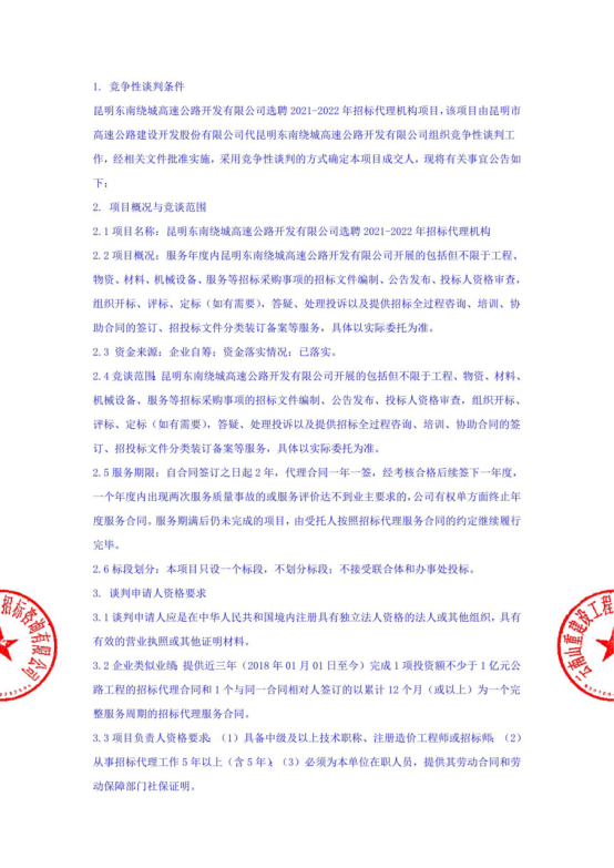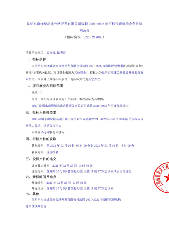 昆明东南绕城高速公路开发有限公司选聘2021-2022年招标代理机构竞争性谈判公告