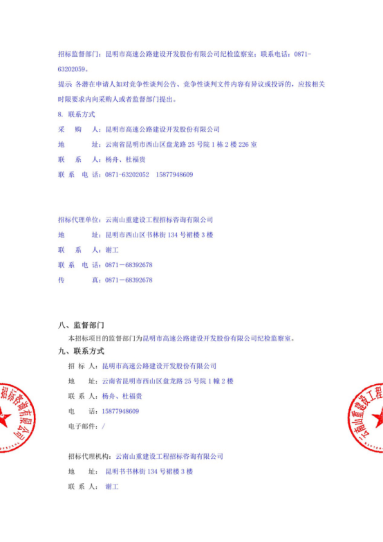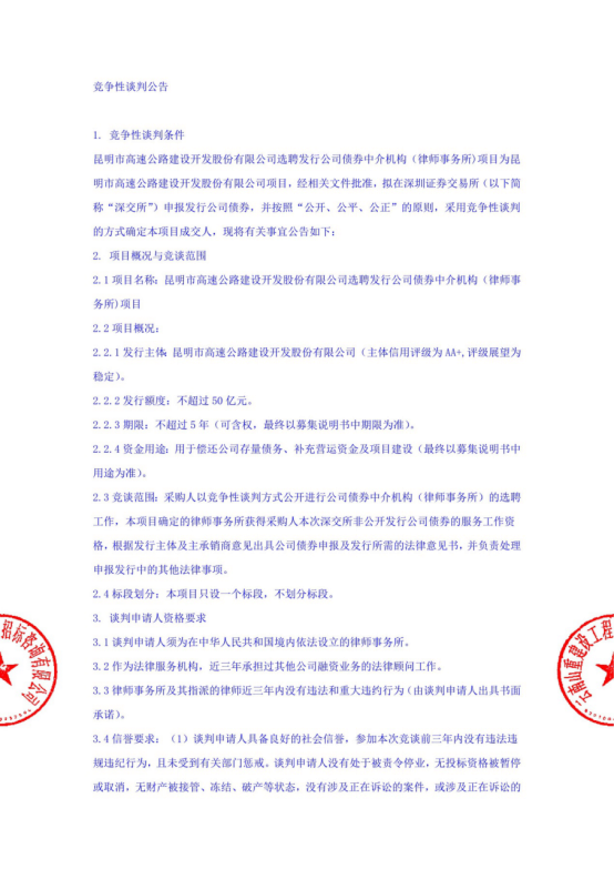 昆明市高速公路建设开发股份有限公司选聘发行公司债券中介机构(律师事务所)项目竞争性谈判公告
