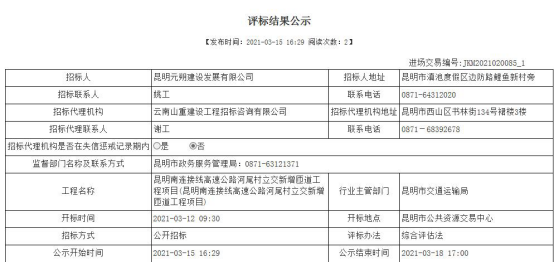 昆明南连接线高速公路河尾村立交新增匝道工程项目评标结果公示