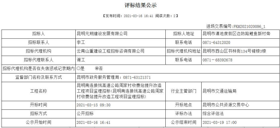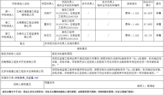 昆明南连接线高速公路周家村收费站提升改造工程项目监理招标评标结果公示