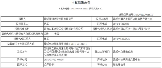 昆明南连接线高速公路河尾村立交新增匝道工程项目中标结果公示