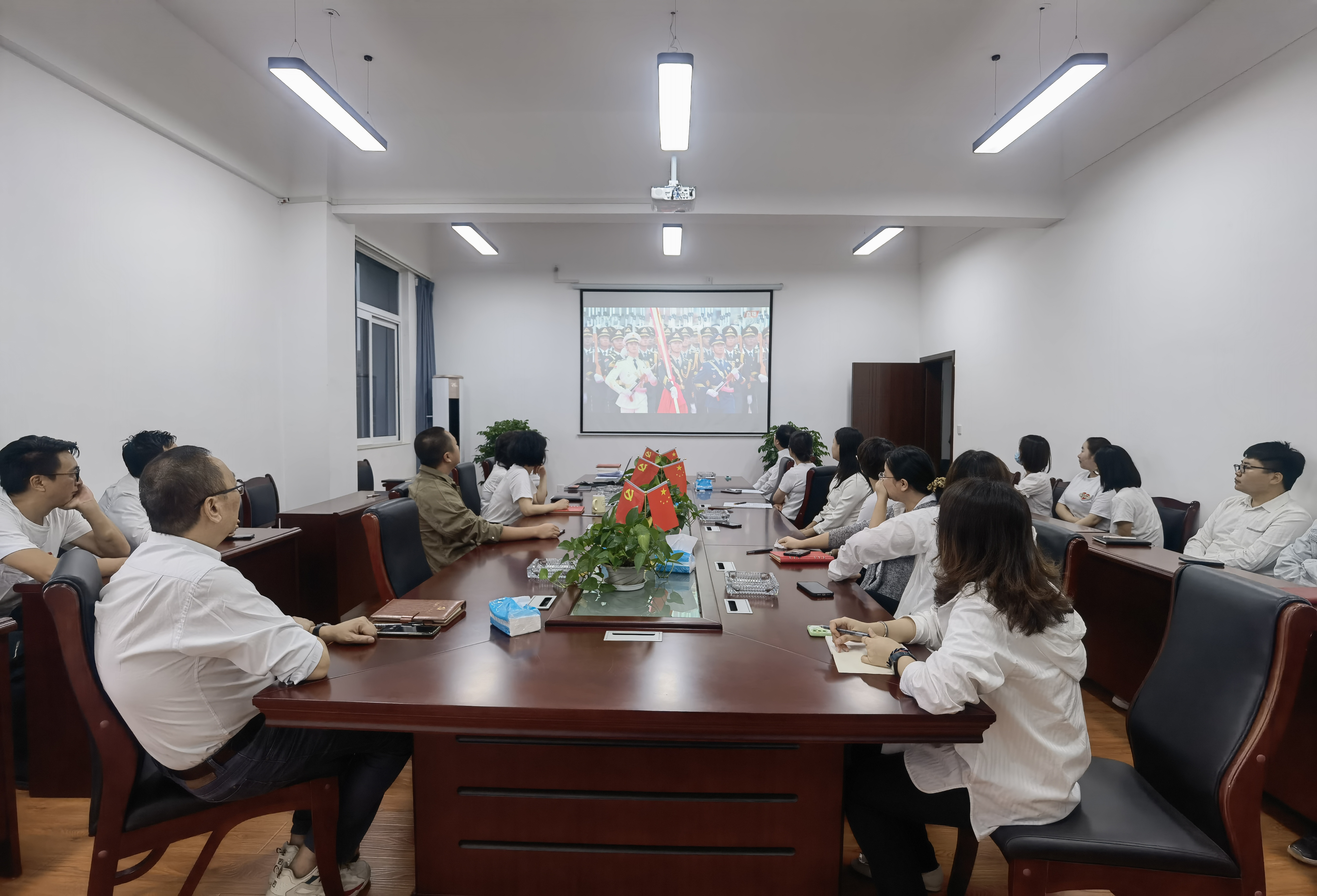 观看过程中,全体同志聚精会神、认真聆听习近平总书记重要讲话,当71架战鹰飞过天安门广场,大家心情澎湃;当习近平总书记庄严宣告:“我们实现了第一个百年奋斗目标,在中华大地上全面建成了小康社会”时,同志们无比自豪;当习近平总书记说到“中国人民绝不允许任何外来势力欺负”时,现场掌声雷动、热泪盈眶。
