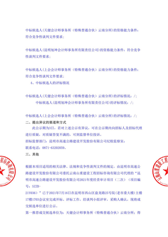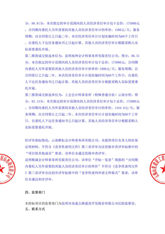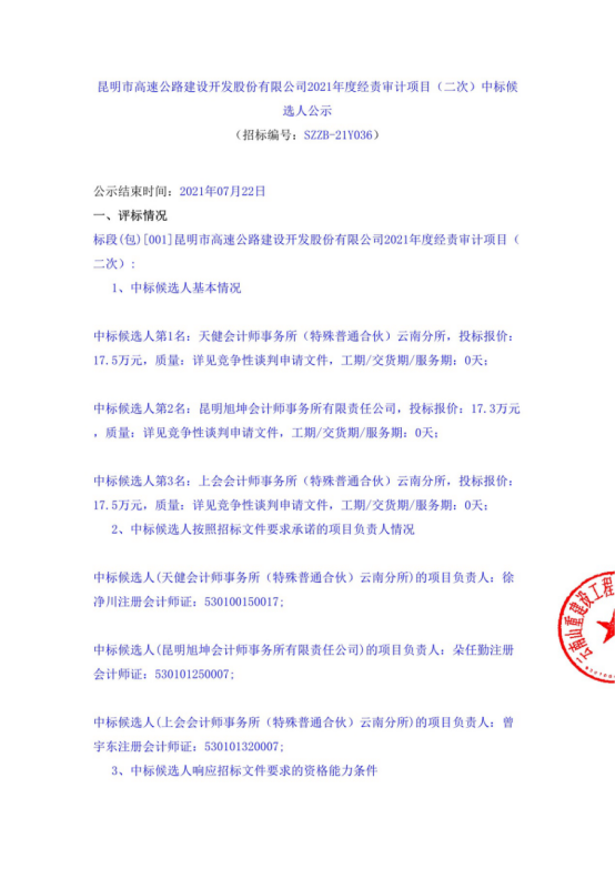 昆明市高速公路建设开发股份有限公司2021年度经责审计项目(二次)中标候选人公示
