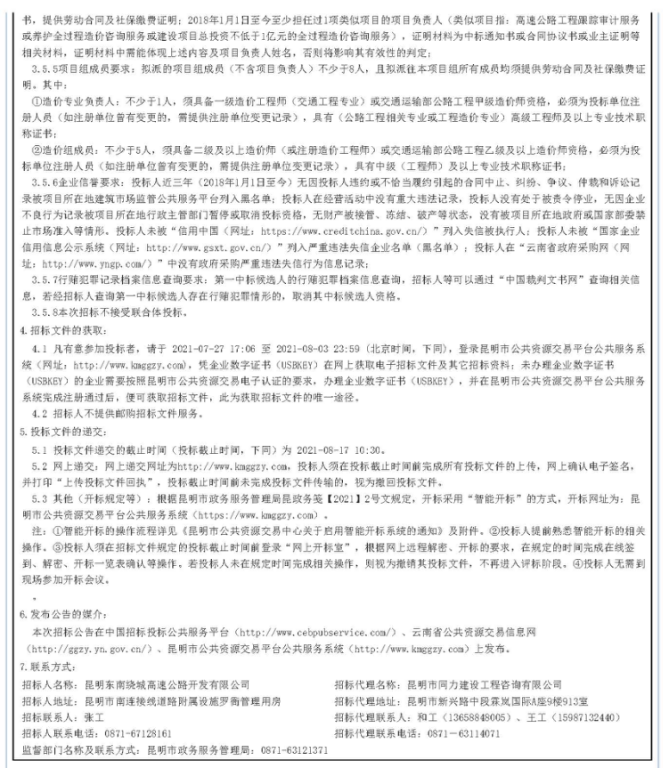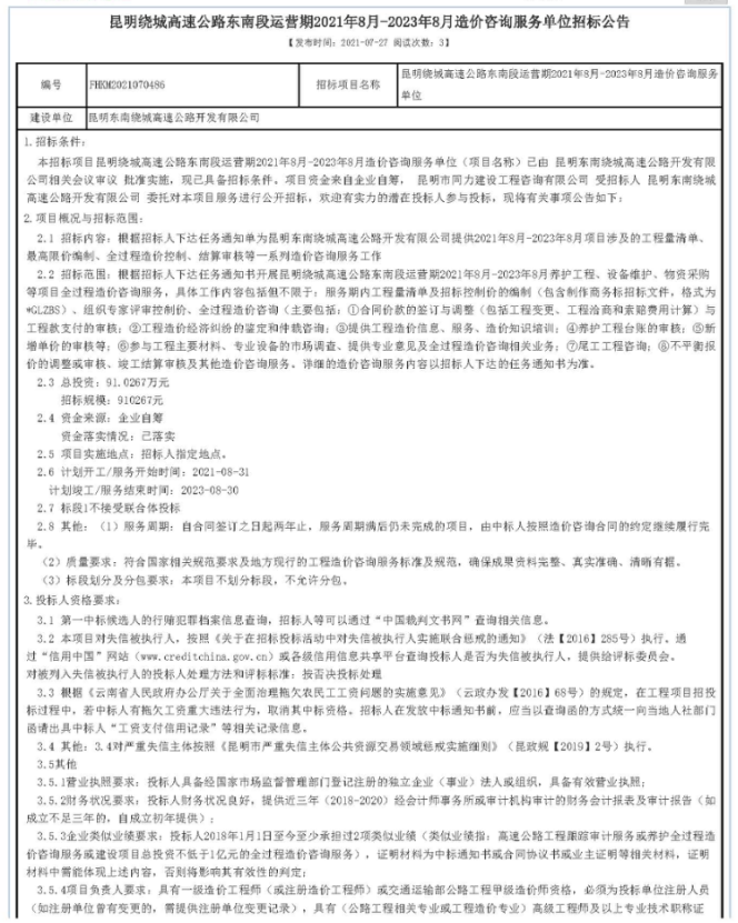 昆明绕城高速公路东南段运营期2021年8月-2023年8月造价咨询服务单位招标公告