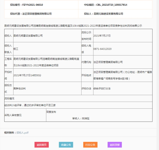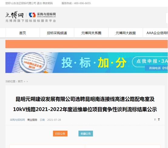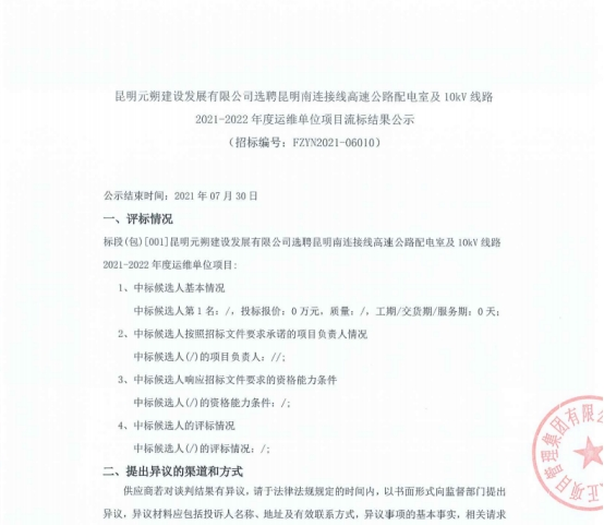昆明元朔建设发展有限公司选聘昆明南连接线高速公路配电室及10kV线路2021-2022年度运维单位项目流标结果公示