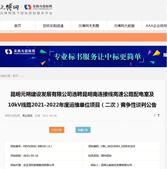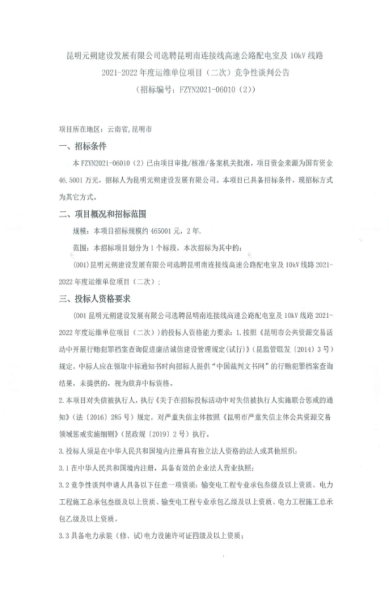 昆明元朔建设发展有限公司选聘昆明南连接线高速公路配电室及10kV线路2021-2022年度运维单位项目(二次)竞争性谈判公告