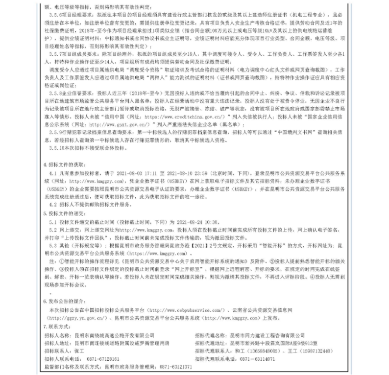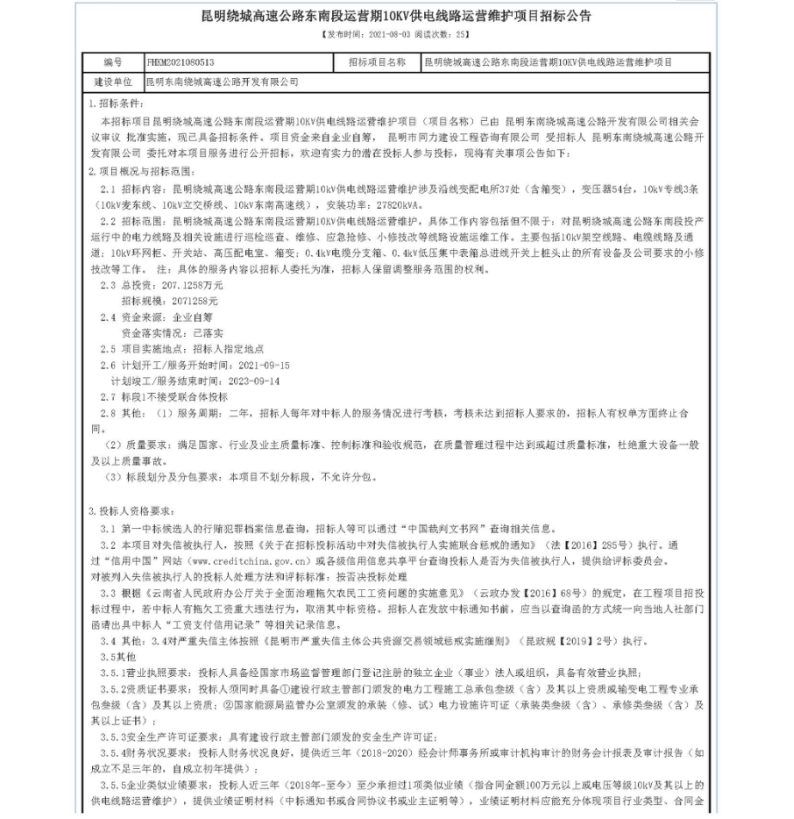 昆明绕城高速公路东南段运营期10KV供电线路运营维护项目招标公告