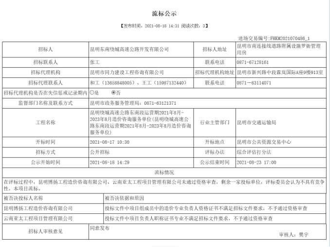 昆明绕城高速公路东南段运营期2021年8月-2023年8月造价咨询服务单位流标公示