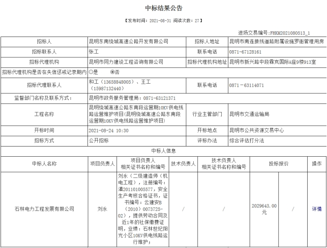 昆明绕城高速公路东南段运营期10KV供电线路运营维护项目中标结果公告