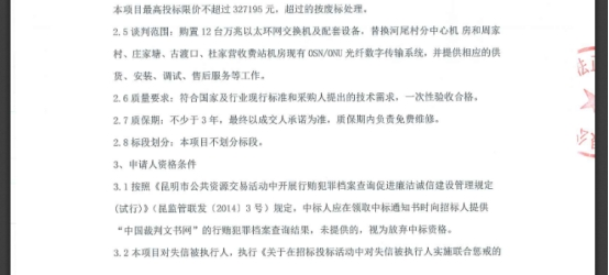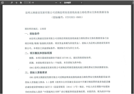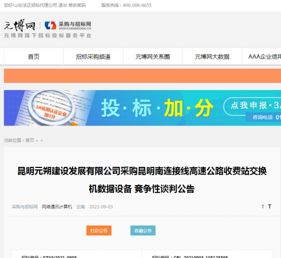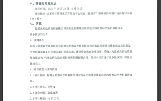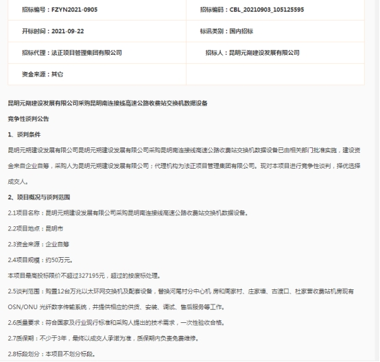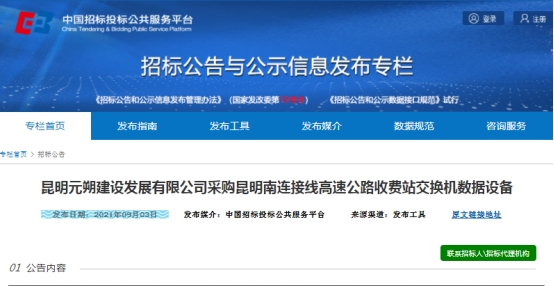 昆明元朔建设发展有限公司采购昆明南连接线高速公路收费站交换机数据设备