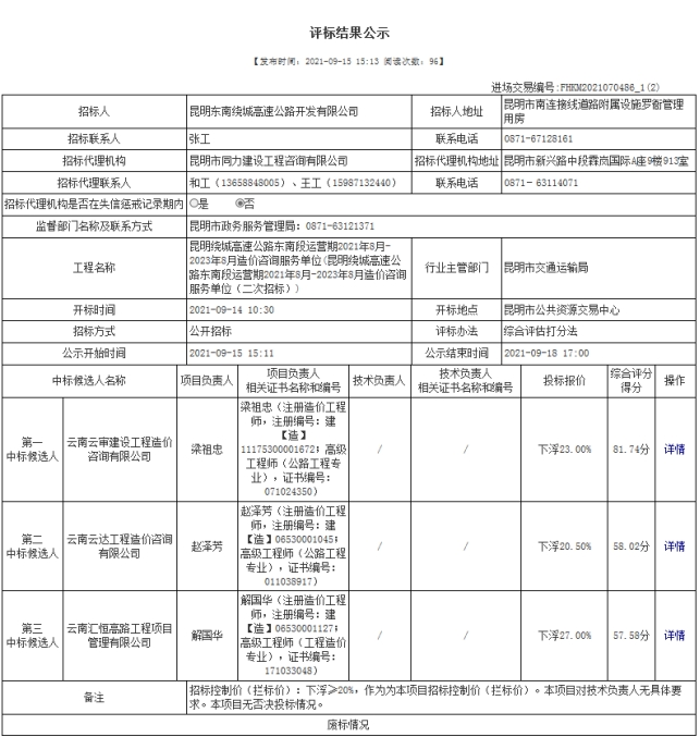昆明绕城高速公路东南段运营期2021年8月-2023年8月造价咨询服务单位(二次)评标结果公示
