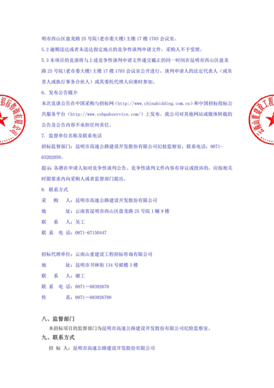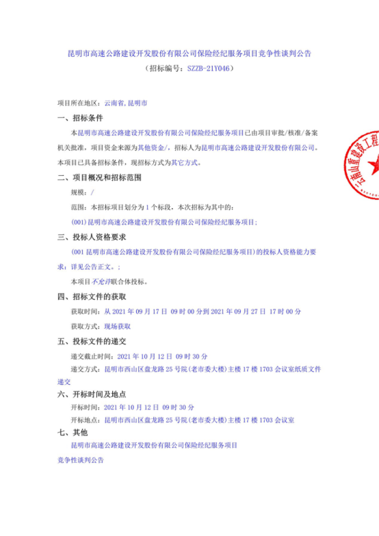 昆明市高速公路建设开发股份有限公司保险经纪服务项目竞争性谈判公告