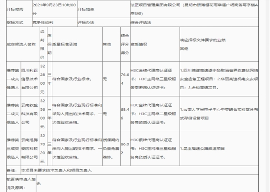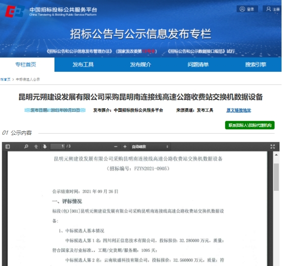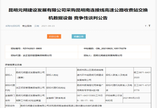 昆明元朔建设发展有限公司采购昆明南连接线高速公路收费站交换机数据设备评标结果公示