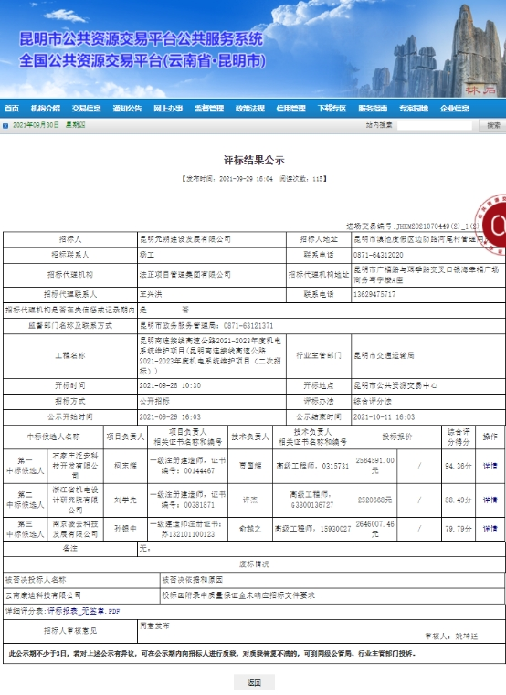昆明南连接线高速公路2021-2023年度机电系统维护项目评标结果公示