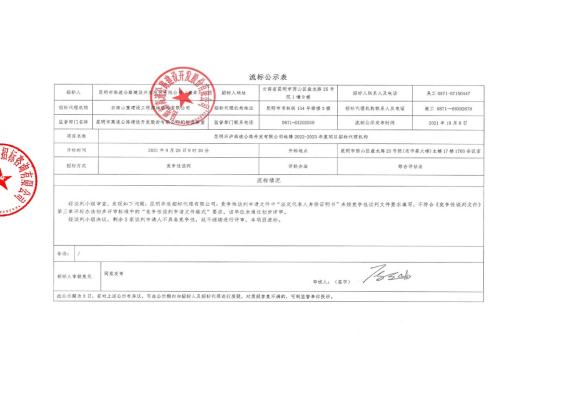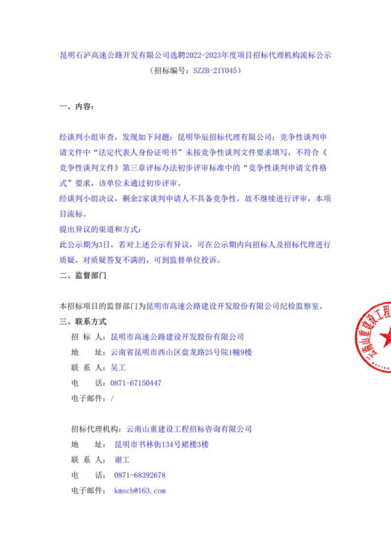 昆明石泸高速公路开发有限公司选聘2022-2023年度项目招标代理机构流标公示