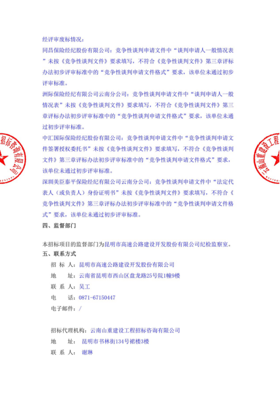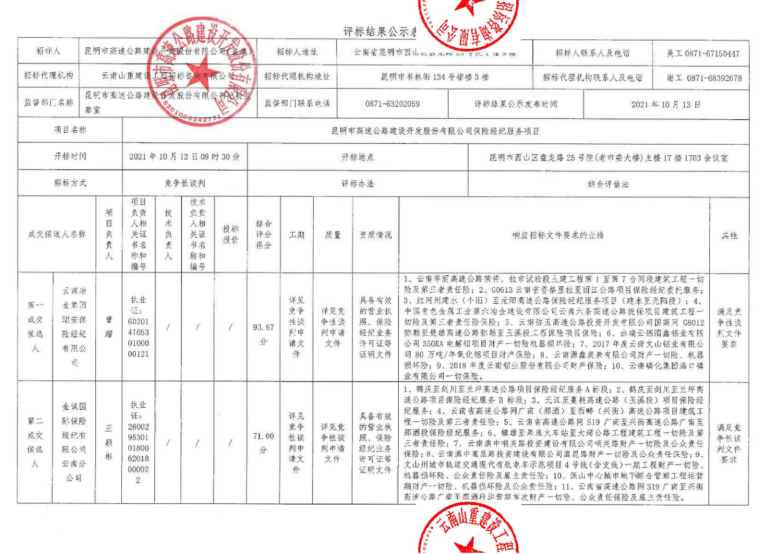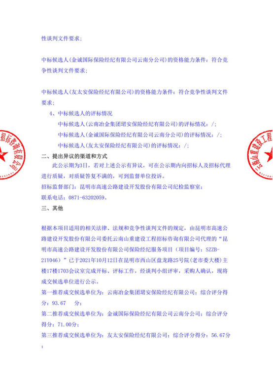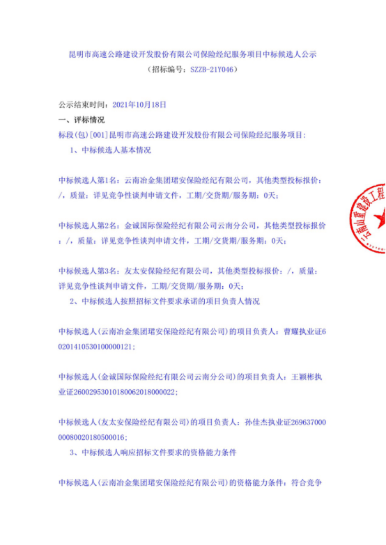 昆明市高速公路建设开发股份有限公司保险经纪服务项目中标候选人公示